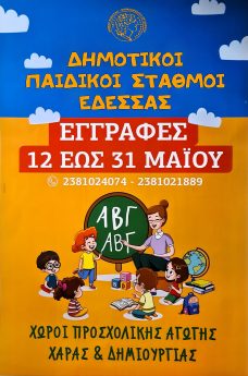 Ο Δήμος Έδεσσας ανακοινώνει την έναρξη κατάθεσης αιτήσεων για εγγραφές/επανεγγραφές νηπίων και βρεφών στους Παιδικούς Σταθμούς και στον Βρεφικό Σταθμό  αντίστοιχα του Δήμου Έδεσσας.