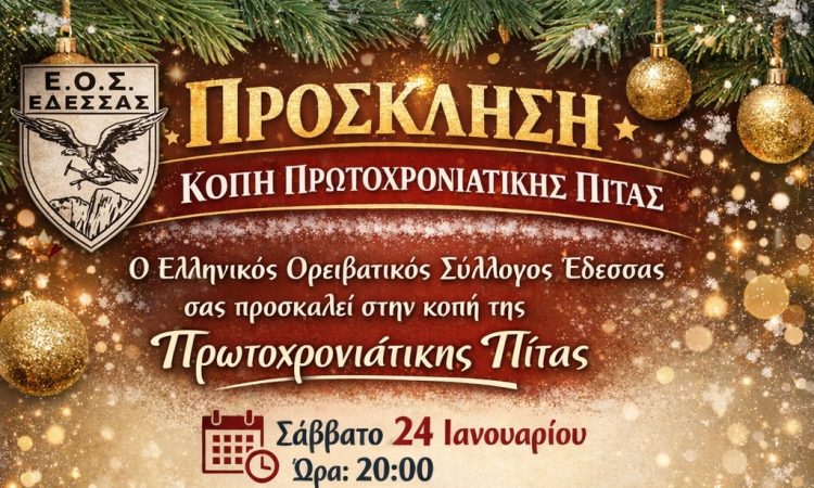 Ο Ελληνικός Ορειβατικός Σύλλογος Έδεσσας σας προσκαλεί στην εκδήλωση κοπής της Πρωτοχρονιάτικης Βασιλόπιτας, το Σάββατο 24 Ιανουαρίου και ώρα 20:00, στη Λέσχη Αξιωματικών Φρουράς Έδεσσας.