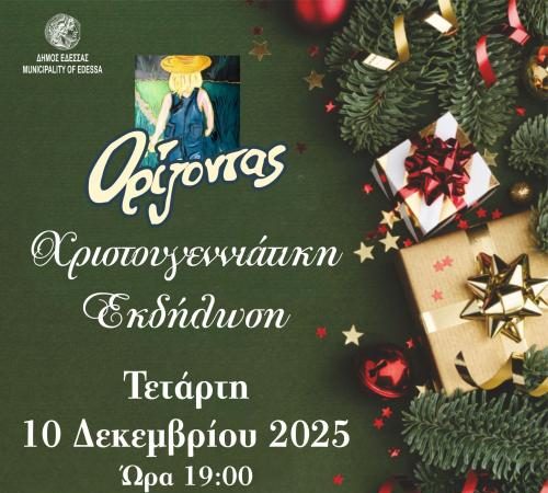 Τα καλλιτεχνικά εργαστήρια του ΚΔΑΠ ΜΕΑ «ΟΡΙΖΟΝΤΑΣ» του Δήμου Έδεσσας διοργανώνουν μια ξεχωριστή Χριστουγεννιάτικη εκδήλωση, η οποία θα πραγματοποιηθεί στην Αίθουσα του Παρθεναγωγείου την Τετάρτη 10 Δεκεμβρίου στις 19:00 μ.μ.