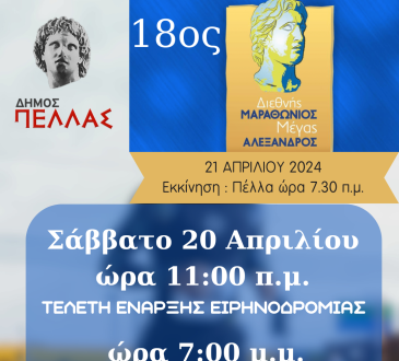 Δ.Πέλλας18 ος ΔΙΕΘΝΗΣ ΜΑΡΑΘΩΝΙΟΣ ΄΄ΜΕΓΑΣ ΑΛΕΞΑΝΔΡΟΣ΄΄11/04/2024510Ο 18 ος Διεθνής Μαραθώνιος Μέγας Αλέξανδρος, θα πραγματοποιηθεί την Κυριακή 21 Απριλίου, με την συμμετοχή δρομέων από όλο τον...