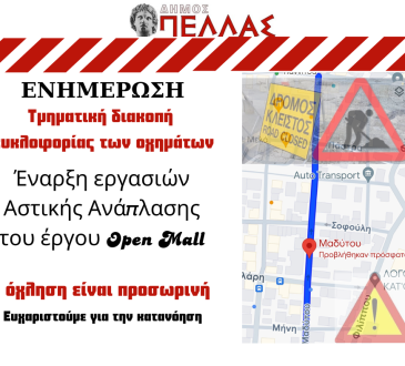 Δ.ΠέλλαςΤΜΗΜΑΤΙΚΗ ΔΙΑΚΟΠΗ ΤΗΣ ΚΥΚΛΟΦΟΡΙΑΣ ΤΩΝ ΟΧΗΜΑΤΩΝ05/04/2024454Τμηματική διακοπή κυκλοφορίας οχημάτων και αλλαγή κατεύθυνσης σε οδούς των Γιαννιτσών -Λόγω της ανάπλασης του Εμπορικού Κέντρου Η ανάπλαση του...