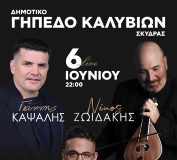 ΚαλλιτεχνικάΓιάννης Καψάλης! και Νίκος Ζωϊδάκης γήπεδο Καλυβίων Σκύδρας03/06/2025447Συνάντηση κορυφής!!! 6 Ιουνίου, Νίκος Ζωϊδάκης,και Γιάννης Καψάλης! με τη συμμετοχή πολυμελούς ορχήστρας !Ο σολίστας Μάκης Τσίκος στο κλαρίνο! Ο...