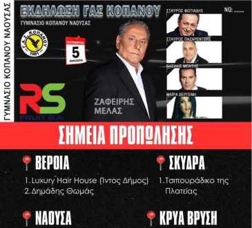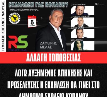 ΚαλλιτεχνικάΕκδήλωση του ΓΑΣ Κοπανού με τον Ζαφείρη Μελά Αλλαγή Τοποθεσίας!05/09/2025277Η μεγάλη εκδήλωση του ΓΑΣ Κοπανού με τον Ζαφείρη Μελά και μοναδικούς καλλιτέχνες αλλάζει χώρο λόγω αυξημένης προσέλευσης! Νέος χώρος:...