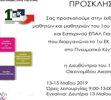 Δ.ΠέλλαςΈκθεση – εκδήλωση «Το ΕΠΑ.Λ. δημιουργεί»13/05/201913/05/20191.3kΤο 1o ΕΚ Γιαννιτσών, συνδιοργανώνει με τη Διεύθυνση Δευτεροβάθμιας Εκπαίδευσης Πέλλας και το Δήμο Πέλλας από 13 έως και 15...