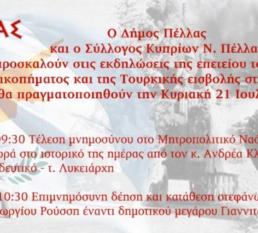 Δ.Πέλλας16/07/20191.7kΟ Δήμος Πέλλας και ο Σύλλογος Κυπρίων Ν. Πέλλας πραγματοποιούν εκδήλωση μνήμης για την τουρκική εισβολή της 20ης Ιουλίου του...